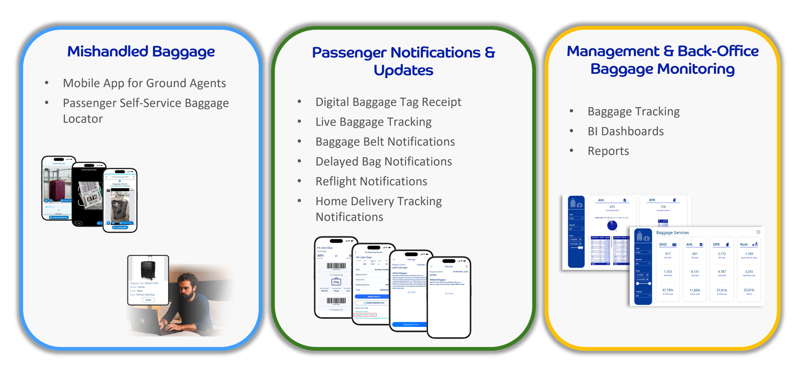 Our Baggage Operations Suite delivers a comprehensive set of digital solutions that streamline and enhance baggage management. The suite supports mishandled baggage management, provides real-time passenger notifications and updates, and equips management teams with advanced baggage monitoring and analytics.